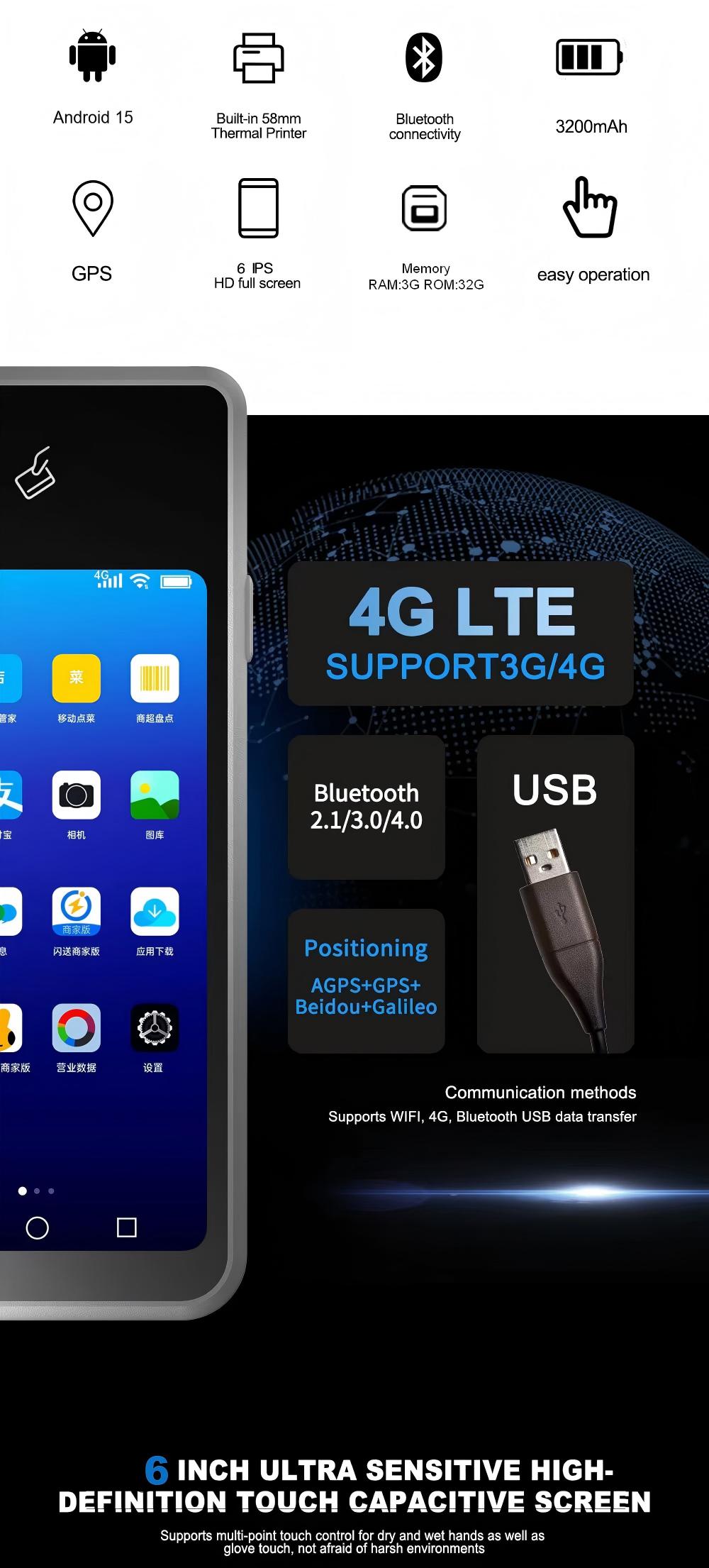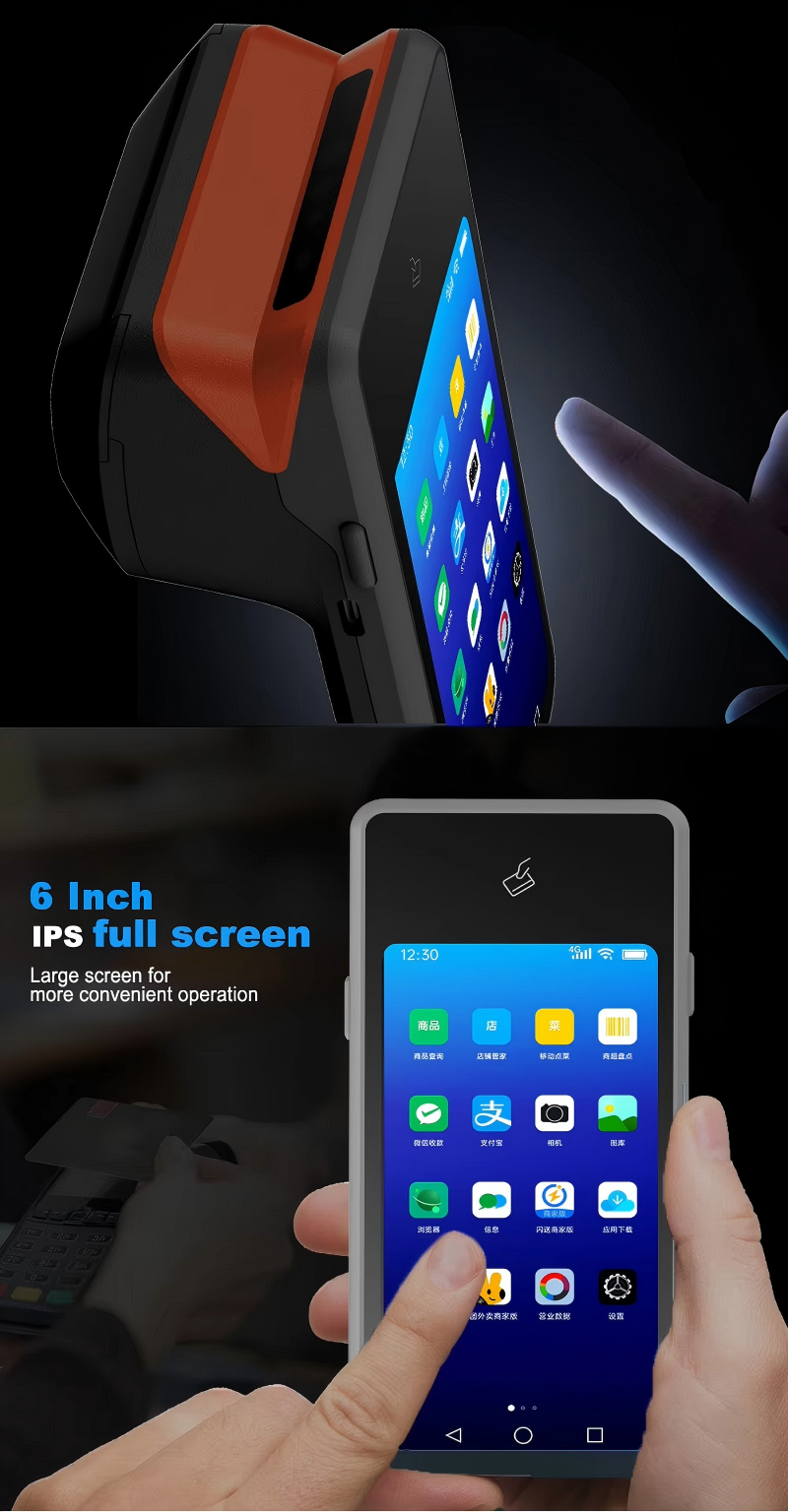 The intelligent POS terminal N2 is Android 15 System with 8-Core 2.3 GHz Processor, 6 inch touch screen, 3GB RAM+32GB ROM memory by default, can upgrade to 4+64GB.